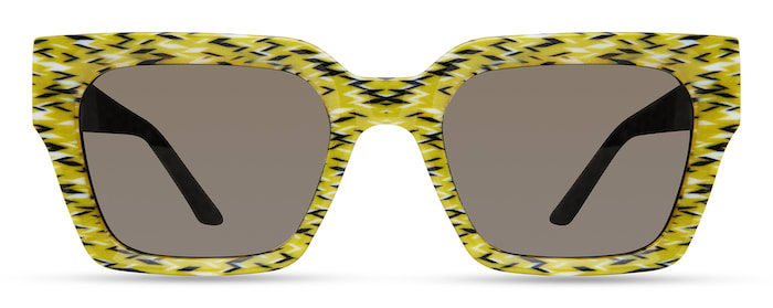 Cassie flaunts a bold, oversized square silhouette, pictured here in distinctively marbled acetate—available in black, crystal, dark tortoise, and yellow black stripe.