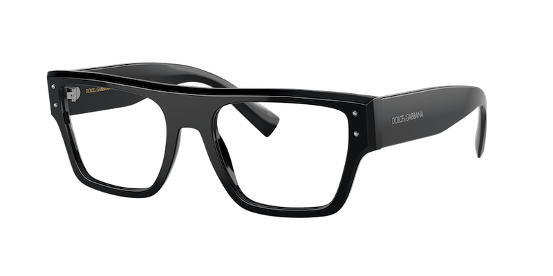 The men’s optical DG3384 features a distinctive faceted flat top with thick, tall temples and metal rivets on the front.