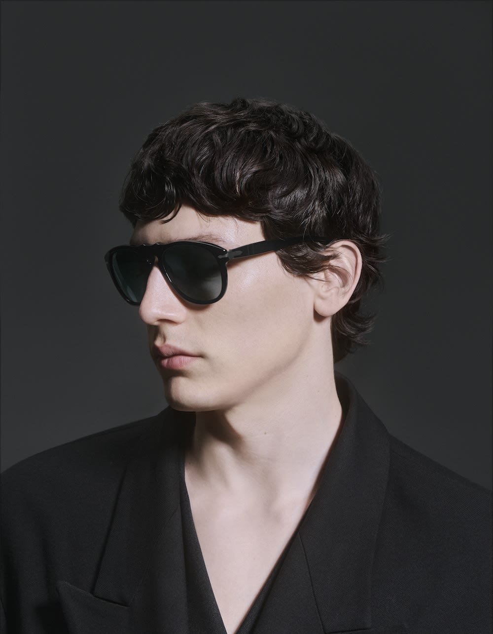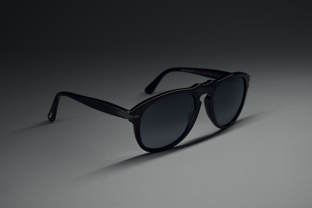 The line emphasizes contrasts—light and shadow, glossy and matte finishes—and focuses on Persol’s signature Arrow hinge, presented as a central design element.