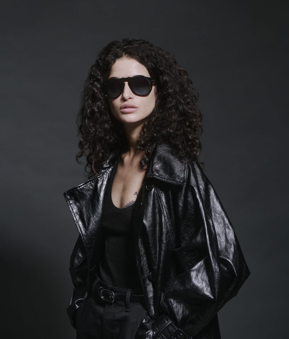 Pictured here, the 0PO0649NE revisits the brand’s well-known 649 pilot shape with re-engineered metal details and a uniform black finish. The signature Arrow is a working hinge that links the front and temples.