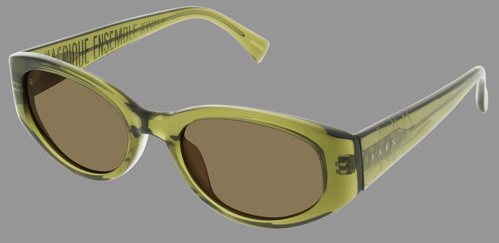 Pictured above, the Kwela features a rounded oval silhouette, added volume, and a sleek, shallow lens height. Crafted from polished, hand-cut acetate and fitted with Zeiss lenses, Kwela is the first frame to showcase Raen’s new exterior temple branding—paired with Mikey’s signature etching on the interior.