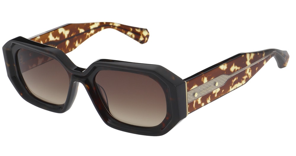 The Minka flaunts a bold flat top with an acetate front and brushed metal temples, featuring a hexagon-shaped jigsaw hinge designed to slot seamlessly into the front.