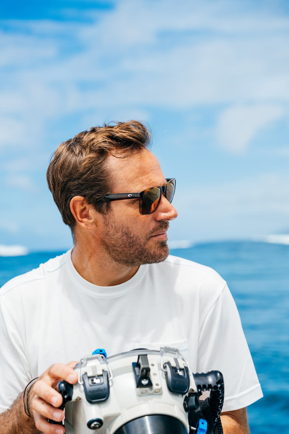 The Los Alijos frame, pictured above worn by renowned underwater photographer Ben Thouard, is a classic rectangle silhouette with chunky, angular temples housing the Costa logo—available in translucent deep blue, tortoise, and matte black.