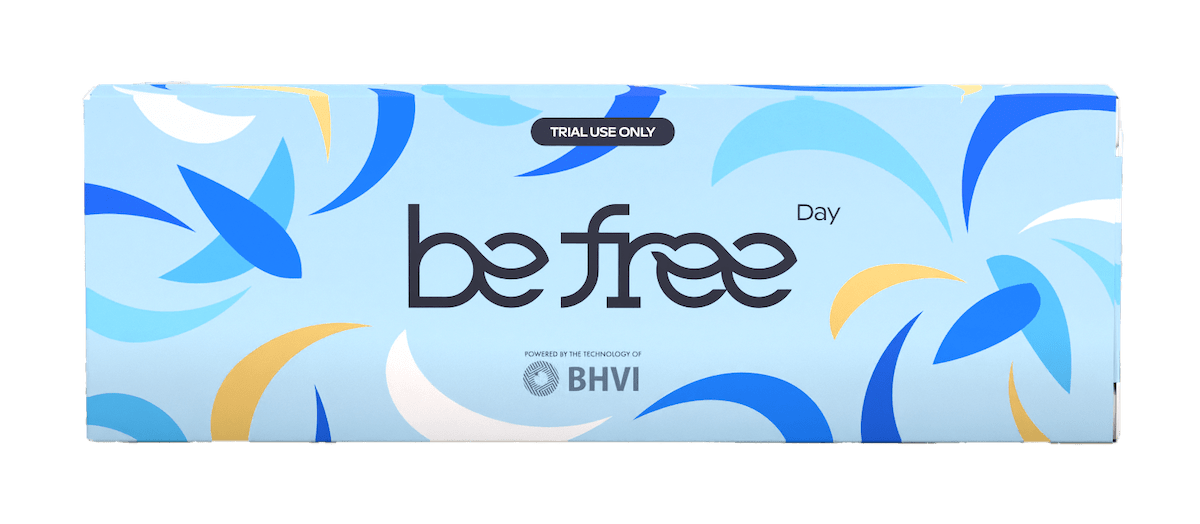 Be Free Day lenses are manufactured from a silicone hydrogel material with oxygen transmissibility values of 91 Dk and 114 Dk/t and include Class II UV protection. The lenses are designed to fit similarly to standard spherical daily disposable soft lenses and are available in spherical powers from -0.50 D to -6.00 D in 0.25 D steps. Trial packs of 10 lenses are available for initial fitting and patient adaptation.