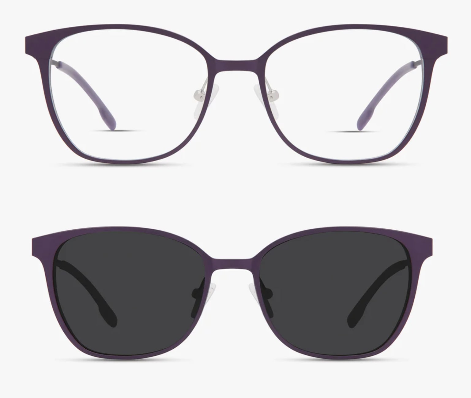 The Beryll is a rounded square optical style crafted from recycled aluminum—available in purple, green, brown, and burgundy with clip-on sun lenses.