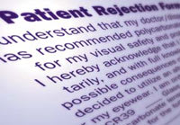 -Carol Farnham A. Here's a suggested format for the Patient Rejection Form which is part of the OLA's Duty to Warn Kit. Bear in mind that Pamela Miller (O.D. and attorney), popular lecturer on Duty to Warn, feels these do not fully protect the doctor (they can always say "I didn't know what I was signing"). Nevertheless, it certainly does impress the patient about how strongly the doctor feels about the subject. Patient Rejection Form Leave room for the patient to sign and date it. There should also be a line where a parent or guardian can sign, if that's appropriate. Finally, there should be a line for a witness to sign (the doctor or dispenser). Most OLA labs can supply the OLA Duty to Warn Kit, which includes a copy of this form. EB Got a question you'd like answered in "Ask the Labs?" Send it now!