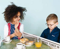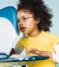 Most dispensers say that there are certain shapes, colors, and materials that are turning kids' heads. Plastics are selling incredibly well; and they are often laminated with two or more colors. Even the trendy thick plastic "nerd" style is ringing up sales. "A lot of children choose the plastic 'Poindexter' look," says Kelli Kupsch, optician and framebuyer at The Glasses Menagerie in Minneapolis, Minn., where 90 percent of the assortment is kids' frames." Adds Faulkner, whose assortment consists of about 75 percent kids' eyewear, "We fit a lot of kids from ages nine and 10 to 13 and 14 with the cutesy thicker plastic frame styles." In addition, metals, always a strong seller to kids, are showing up in new shapes like rectangles and octagonals, as well as cat-eye shapes for girls. Shofner says her kids assortment is about 97 percent metals. And, color in all frame materials is taking its cue from adult styles as well. Popular hues include deep reds, browns, olive greens, and tortoise. But more daring shades appeal to the trendier set-black, bright red, bright blue, and clear pastels in plastics.