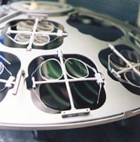 Edged lenses are mounted in a rack and ready for insertion into an AR chamber. |