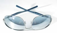 Another way the fashion tint trend has evolved over the past year is in the type of frame to which it is applied. Even though all those interviewed say tints and gradient are utilized mostly in three-piece rimless mounts, shields with metal outlines have become an up-and-coming look as well. But perhaps the newest frame treatment of all is combining gradient tints with clear plastic frames that have a light wash of color in the same hue as the lens tints.