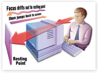 When viewing a monitor screen, the focus of the eyes tends to relax to a point somewhere beyond the monitor screen, called the "resting point of accommodation" or RPA. As a result, the eyes must constantly refocus back to the computer screen.
