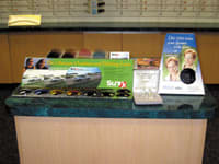 Each dispensing table features a mat with four levels of lens options, from top to bottom. The "Ultimate" features a 1.67 high index lens with No Glare and scratch resistance for $125. The next level is the "Ultra," a 1.56 mid index lens with No Glare and scratch resistance for $95. "Premium" is the next lens package and is a polycarbonate lens with No Glare and scratch resistance priced at $80. The final package is "Performance," a CR 39 lens that comes with No Glare, UV protection, and scratch resistance for $60.