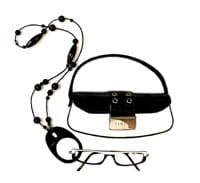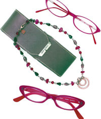 Left to right: Cinzia's sleek black-and-white reader, case, and retainer go with ease from day to evening wear; Sherry Wolf's eyewear loops double as necklaces and feature complementary earrings to complete the look. Corinne McCormack stays in touch with the colors of the moment with readers, case, and stone eyewear loop in black raspberry; Sax North Atlantic Services makes a home for eyewear at the office with a combination photo frame and shearling-lined eyewear cup, offered in leather or patterned fabric |