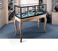 Shown top: A hand display from Magic Design/Visual Dynamics can be used in sunwear promotion. Below: A glass case such as the Provence Showcase from Fashion Optical Displays can display sunwear |