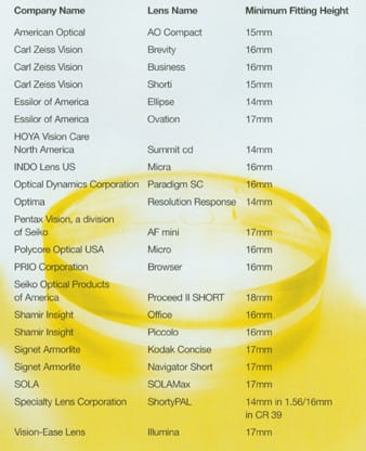 Many companies have not only minimum segment height measurements, but also minimum space measurement from the pupil to the brow rim of the frame. Check with manufacturers for their measuring and fitting details as well as frame size recommendations.