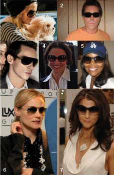 1-I: David Beckham in Police for Eastern States; 2-H: Mariah Carey in Robert Marc; 3-B: Mary J. Blige in Christian Roth for Charmant; 4-G: Debra Messing in Vogue for Luxottica; 5-C: Britney Spears in Vogue for Luxottica; 6-A: Paula Abdul in Fendi for Marchon; 7-J: Jeremy Piven in John Varvatos for BaseCurve; 8-E: Samuel L. Jackson in Jhane Barnes for Couteur, by Kenmark; 9-F: Eva Longoria in Gucci for S�filo; 10-D: Jessica Biel in BCBG Max Azria for ClearVision