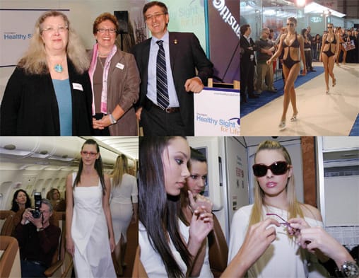 Clockwise from top left: Transitions announces its Healthy Sight for Life initiative; Sàfilo shows off its latest at fashion shows; fashions hit a high in an ANFAO in-flight fashion show