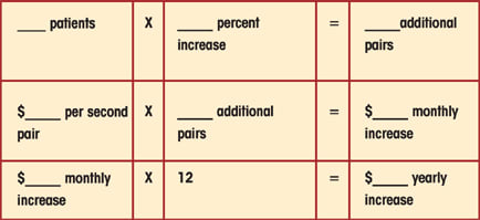 Don't take our word for it. Using this formula you can calculate the bottom-line impact of converting patients and increasing sales in key areas, including AR, high index, photochromics, polarized, and multiple pairs.![]() See the following samples and exercises borrowed from the "Telling the Best Story" workbook (to order, call 800-848-1506) to determine what embracing these steps can do for revenues. Each exercise provides an industry-standard example, and space to insert your practice figures to make your own calculations. The samples are based on the following average industry statistics from the workbook: • 176 exams/month • 68 percent capture rate • 120 patients/month • $275 average revenue from exam and Rx • $33,000 average revenue/month (patients × average $) • Photochromics yield an average of $80 in additional revenue per pair • AR provides on average of $60 in additional revenue per pair • Polarized sunglasses bring in an average of $250 in additional revenue per pair • Selling a second pair increases revenue by an average of $175 • Converting from bifocal to PAL yields an additional $120 revenue per pair |