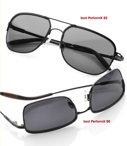 IZOD PERFORMX SUN FROM CLEARVISION The Izod name is synonymous with clean, modern, masculine designs that keep up with an active lifestyle. ClearVision Optical's Izod PerformX memory metal sunglasses offer memory metal bridge and temple components and custom double- injected plastic temple tips. Brand manager Pam Elfreich notes, "The Izod PerformX consumer values memory metal designs that can hold up to their active lifestyle needs. Combine this feature with a high quality, polycarbonate, polarized sun lens and a TriflectionTM flash mirror lens coating that cuts glare and you have an outstanding product that the Izod customer will appreciate wearing while golfing, driving, fishing, or any other activity they enjoy doing outdoors." A sporty sunglass case is also included with each pair. Call 800-645-3733. |