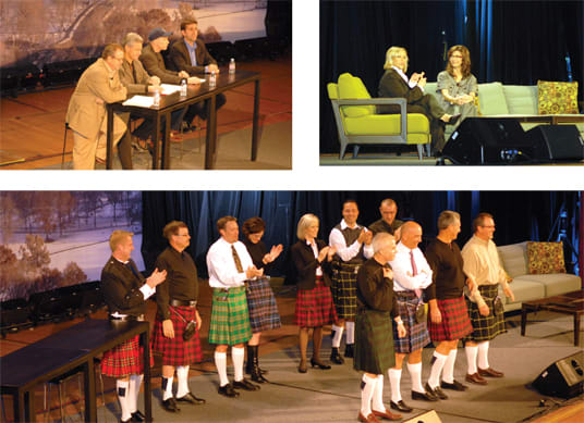 Clockwise from top left: Essilor's Mike Daley, Bob Colucci, and Carl Bracy discuss Varilux with the master of ceremonies; Essilor's new spokesperson Finola Hughes (r) is interviewed on stage; Essilor execs and the Crizal team introduce "Scotchgard" in style; Hubert Sagnieres announces plans for the Essilor Vision Foundation