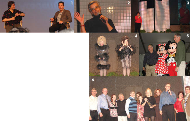 1. Keynote speaker Guy Kawasaki (l) and Transitions' new president Brett Craig (r) talk about The Art of Innovation. 2 Marketing director Latin America Vanessa Johns motivates attendees. 3. Director of North American sales Connie Falvo keeps the momentum going. 4. Iris (l) and Retina (r) get the crowd laughing. 5. Jose Alves and Dave Cole (r) make nice with Minnie and Mickey at the Passport to Discovery wrap-up. 6. Soderberg Ophthalmic Services, Inc. won Transitions Lab of the Year award for the second time