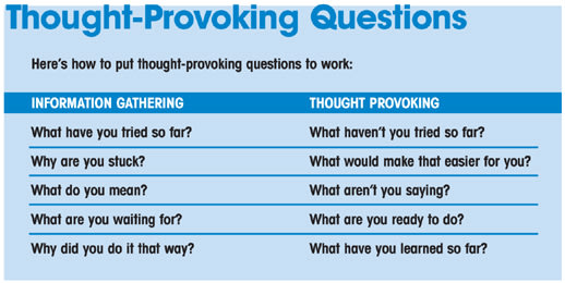 • Ask thought-provoking questions: There are two basic types of questions: Ones that simply gather information, and those that deepen the learning of the person being asked. The latter category is far more powerful and thought-provoking.