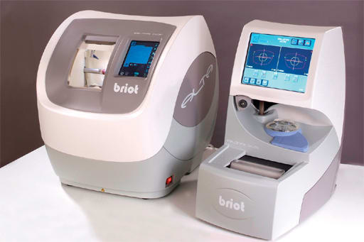The Briot Alta SX finishing system has a touch-screen interface and a compact tracing, centering, and blocking unit 4 COATINGS: Lens technology continues to evolve, and edgers used to have problems with the hydrophobic and super hydrophobic coatings. The newest versions of edgers have technology in place to ensure tight grips with less slippage, and soft-grind modes that avoid damage to the coating. 5 EASE OF USE: Automation is still a driving force for edgers' popularity. Push-of-a-button operation is vital, with ECPs using regular staffers (or themselves) to run the equipment. Tricky placements and complex calculations are now all done by the equipment. 6 SPEED AND ACCURACY: Everybody wants it done fast, as that means less man (or woman) hours in the lab. And everybody wants accuracy, for obvious technical and optical reasons, but also to reduce spoilage. 7 FLEXIBILITY: With ever-changing lens styles and shapes, edgers have had to become very flexible in their processing capabilities. Yes, they have to be able to drill, handle every lens material and every coating, and be able to handle a variety of lens shapes, sizes, and base curves without sacrificing grooving and beveling accuracy or fit. |