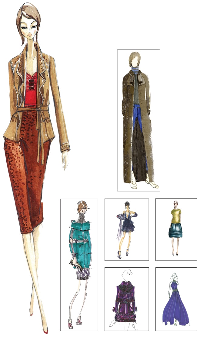 Sketches, counterclockwise from top: Yigal Azrouël; Erin Fetherston; Tracy Reese; Carmen Marc Valvo; David Rodriguez; Alvin Valley