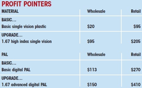 “Our PAL sales are 50 to 55 percent of our total multifocal sales, and our AR percentage is 45 percent,” she reports. “Our average sale to our customers with vision plans is usually over $400, while our average sale to our private pay customers averages around $350.”