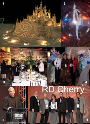 1. The ultimate sand castle greets guests along the beach in Hollywood, Florida, for Essilor's annual National Sales meeting; 2. Dancers enclosed in bubbles flex, stretch, and dance at the gala dinner; 3. Guests arrive to an elegant backdrop at the Independent Distribution Division dinner; 4. Attendees are welcomed to the event by a pair of fairy princesses, replete with feathers and wings; 5. Essilor's Carl Bracy tells attendees about marketing strategies and promotional plans for 2010; 6. Flanked by Essilor executives, RD Cherry receives both the IDD Lab of the Year honors and the Crizal Award of Excellence |