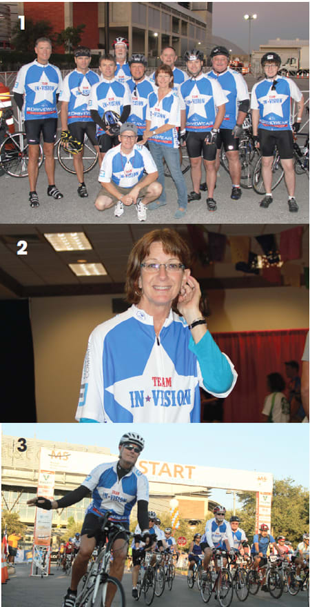 1. Team In-Vision riders and volunteers pose for a group shot; 2. EB senior editor and Team Champion Karlen McLean strikes a pose before walking the runway to model Team In-Vision's jersey; 3. They're off! Team In-Vision begins the Valero 2011 Alamo Ride to the River |