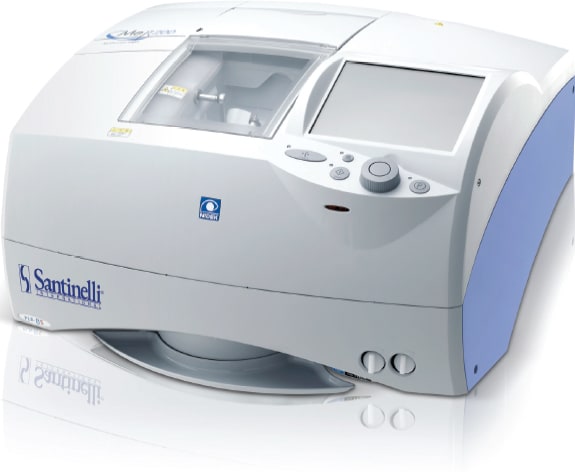 ■ SANTINELLI INTERNATIONAL's retail edging line now includes the Me 1200 compact tabletop lens edger featuring step-beveling for any high-wrap frame, high-curve beveling, partial beveling, partial grooving, design cut, faceting, advanced shape editing, exclusive 3-D grooving, whisper-quiet drilling and notching, all three-piece mount processing capability including Chemistrie Sunlenses with Click Mode, advanced polishing functions, and a diamond grooving wheel. Dimensions: 14'' H x 23.6'' W x 19.5'' D.