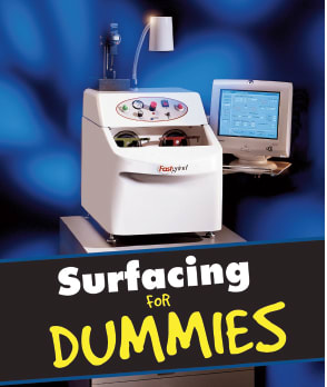 ■ SUPER SYSTEMS OPTICAL TECHNOLOGIES' Fast Grind for Dummies offers faster production and the ability to produce digital-quality (made from digitally-produced molds) PALs and bifocals, including the new ADDVantage PAL and all of the latest multifocal and single-vision lens designs. A three-pad process generates, fines, and polishes lenses using tap water. Dimensions: 28'' x 27''.