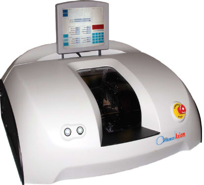 ■ NATIONAL OPTRONICS' Axiom Surface Generator, a third-generation, tabletop in-office generator, provides complete lens processing including generating, cribbing, and pin-beveling in one process step. An upgraded processor drives unsurpassed generating speeds using dry-cut technology. Features include advanced tooling options, integrated smart software, and worker-friendly touchscreen procedures. The unit can cut curves from +6.00 to −30.00D. Dimensions: 21.5'' H x 35.5'' W x 26'' D.