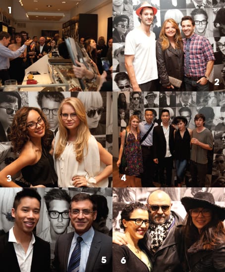 ![]() | 1. Guests gather at Optica for the Los Angeles exhibit; 2. Mike Rosenthal, Wanda McDaniels, and George Katsiopoulos; 3. Savanah Jade and Kelli Gross; 4. Guests pose with JustJared.com's Jared Eng; 5. Jared Eng with Glenn Reisch, president of Luxury Optical Holdings; 6. Selima Salaun, Bernard Aidan, and Catherine Malandrino in NYC |