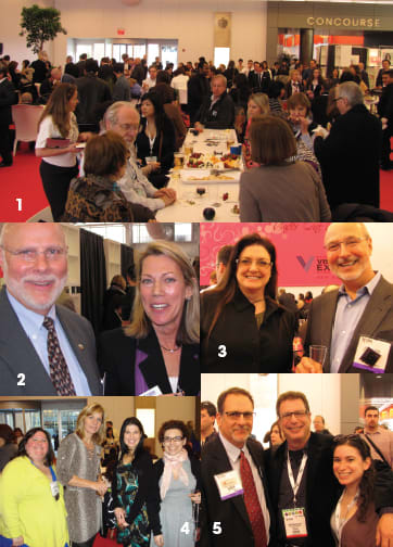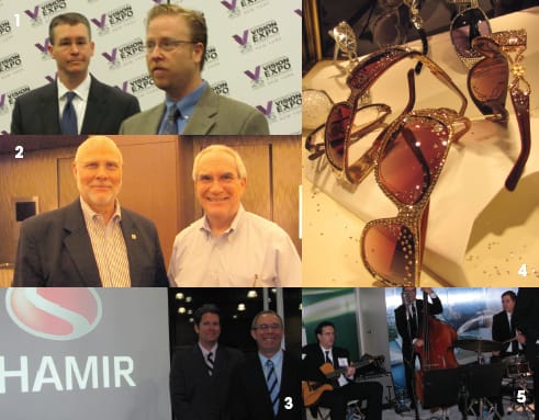 1. Coburn Technologies' Curt Brey (l) and Alex Incera at Coburn's press conference; 2. The Vision Council's CEO Ed Greene (l) and Optical Laboratories Association executive director Bob Dzuiban; 3. Matt Lytle (l) and Raanan Naftalovich of Shamir Insight at a press conference; 4. A Jimmy Crystal New York frame display adds pizzazz to the show floor; 5. The Lapis Luna vintage jazz band at the PixelOptics booth serenades attendees