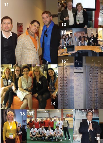 6. Essilor of America's Howard Purcell (l) and Carl Bracy (r) with Bob Colucci (c) at Essilor's press conference; 7. Pro Fit Optics and Nigura Metzler announced a partnership, Smart Eyewear Complete Eyewear program; 8. Amy Ahl, Rochester Optical, Shamir iPad winner; 9. Transitions Optical R&D team members at their booth; 10. A flipbook filming at Luxottica's Persol station; 11. Mykita's (l to r) Daniel Haffmans, Phillip Haffmans, and Moritz Krueger at the frame company's party at the CUE Art Foundation; 12. Drawing winner Sheila Crawford with A&A Optical's Robert Liener; 13. George Westinghouse High School students at the Zyloware booth; 14. ClearVision Optical's team at the BCBGMAXAZRIA event; 15. A&A asks attendees, “What will you Celebrate?” in honor of its 40th anniversary; 16. Shamir drawing winner Sue Devore, Pearle Vision Center; 17. Bevel's Soccer for Charity event raised over $1,000 for Doctors Without Borders; 18. Clay Musselwhite at Pixel Optics' emPower! press conference