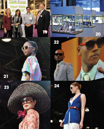 19. Courtney Muller (l) and Tom Loughran (r), vice presidents of Reed Exhibitions, present the Best New Product award to Carla Montana and Peter Montana of Miraflex Glasses; 20. The latest products are displayed throughout the New Product Gallery; 21-24. Models pose in some of the season's latest clothing and eyewear fashions at the Safilo Runway Show, emceed by fashion expert Carson Kressely |