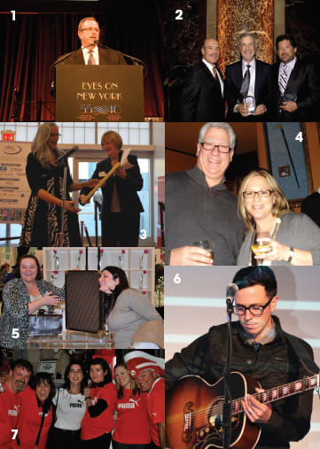 | 1-2. Eyes on New York Gala co-chair Mike Daley and co-chair VSP's Rob Lynch with honorees Marchon's Larry Roth and Al Berg; 3. OWA's Grady Culbreth presents the Pleiades award to Christie Walker; 4. Event sponsor Satisloh's Larry Clark with Live's Karen Zappia at the EyeRock Concert; 5. The Vision Council's Eve Zartman-Ball (l) and guest at the OWA event; 6. Matt Morris performs at the William Rast party; 7. Charmant Group's reps at the Puma launch party; 8. Andrea Sobel and Nicks Ericsson of the William Rast brand with Viva's Frank Rescigna; 9. Guests mingle at Safilo's Tommy Hilfiger party; 10. Enjoying the Oliver Peoples' party; 11. Event sponsor Luxottica's Dr. John W. Lahr and guest at EyeRock |