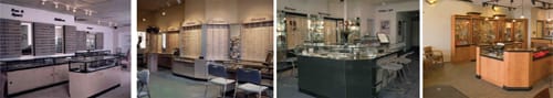 Eyewear dispensing has gone from a modified medical office to a more style-savvy setting. Lighting, furnishing, and color choices have changed over the years, reflecting the shift of optical dispensing from strictly medical to a more retail-driven focus. Images from current and vintage projects above courtesy of Fashion Optical Displays