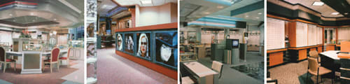 | Neon: The '80s and '90s saw the prolific use of neon lights throughout optical stores. “It was above cabinets, on walls, and in logo signage—the brighter the better!” says Cy Furman, president of Magic Design. Adds Jan Ennis, president of Ennco Display Systems, “Neon was hideous. Ok, we took part in it and we apologize.” Plastic Displays: “Cream colored plastic vacuum-formed displays that yellowed over time were likely the worst trend of the past 25 years,” says Ennis. “They attracted dust and nobody knew that they would change color over time. We did NOT participate in this trend!” Oak Furniture: The overabundance of this wood used for furniture and displays made offices with this look appear dated after a few years. “It was so overdone,” says Ennis. “Now you hardly get oak laminate since it's so out of style.” Gaudy Color: “I am still surprised when I see pictures of displays that are green and purple or mauve and gray, which were popular combinations two decades ago,” says Lori Estrada, co-owner and designer with Fashion Optical Display. “There were also some popular displays made with a shiny gold material called Tambour, which now seems so gaudy, but back then it was state-of-the-art.” |