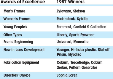 In 1987 when the Awards were first given out, only seven categories existed: Men's Frames, Women's Frames, Young People's, Other Types, Frame Engineering, New in Lens Development, and Fabrication Equipment. Twenty-five years later, the number of categories has doubled to 14. Awards will be given in the following categories: Dress Frames, Specialty Frames, Children's Frames, Lens Design, Lens Materials, Lens Treatments, Marketing, Software Tools, Surfacing Equipment, Surfacing Material & Tools, Lens Treatment Equipment, Finishing Equipment, Finishing Material & Tools, and Accessories.