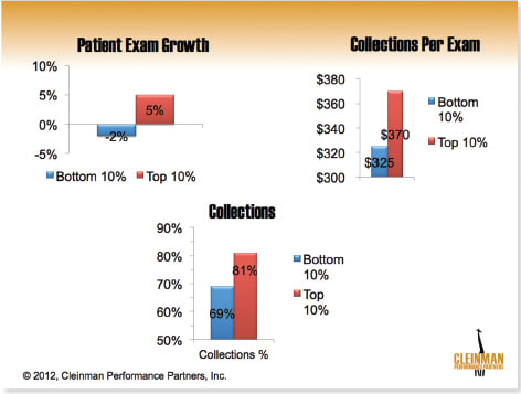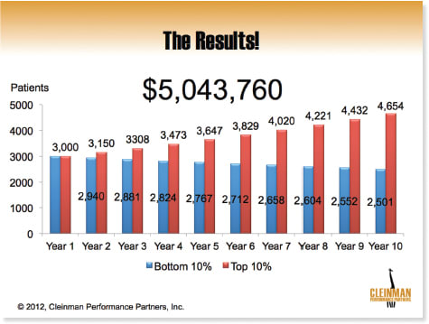 To ascertain these differences, we simply compared the outliers: those practices that were in the bottom 10 percent of investment versus those at the top. The survey results are from data submitted by members of Cleinman Performance Network and are not intended to communicate national averages.