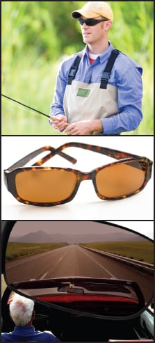 For fishing and driving, polarization can help improve visual acuity and performance. Image above courtesy of Revo; images below (top to bottom) courtesy of Transitions Optical, Vision-Ease Lens, and Carl Zeiss Vision