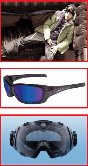Sports eyewear designs boost performance and fun. Top to bottom: Olympic gold medalist snowboarder Seth Wescott in Bollé goggles; Wiley X style The Gravity from the Climate Control series; Zeal style iON features a camera with control buttons on the side of the goggle