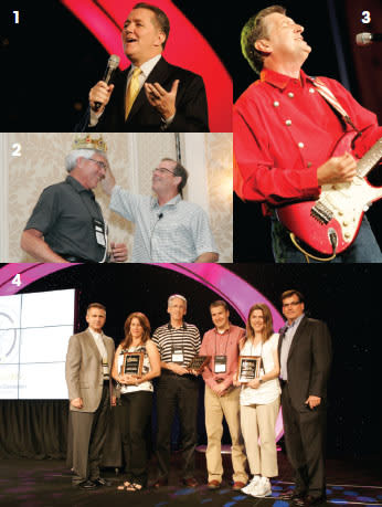 1. Keynote speaker Dennis Snow addresses meeting attendees; 2. Bill Breen, OD, Vision Source administrator, receives the Golden Spur award from Rob Houdek, OD, Vision Source senior vice president of business development; 3. Kevin Clay provides a musical introduction for Paul Karpecki, OD, during the Focus Laboratories presentation, a Platinum Partner of the 2012 North American Meeting; 4. (l to r) Glenn Ellisor, OD, presents awards to Joanne Reed, OD, PA; Greg Clay, OD, FAAO; Jason Rhynes, OD; and Christina Schropp, OD, alongside Tracy Moody, Vision Source COO