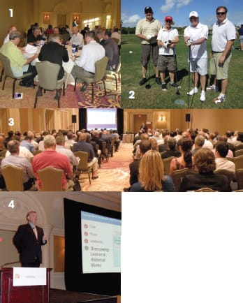 1. Attendees participate in breakout sessions; 2. (l-r) Quest Optical’s Ed de Rojas, REM’s Mike Hundert, Kenmark’s Don Howard, and Smith Optical’s Scott MacGuffie play golf; 3. Keynote speaker Brian Beaulieu addresses attendees; 4. Keynote speaker Adam Hartung, Spark Partners
