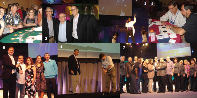 1. Attendees enjoy some casino fun after the event’s finale; 2. Transitions’ Dave Cole, Jose Alves, and Brian Hauser; 3. There was no shortage of music or entertainment at the Academy; 4. Bob Hughbanks (l) and Bob Mares (r) of Expert Optics; 5. 2011 Transitions Lab of the Year Optical Prescription Lab; 6. Larry Lampert, OD, makes a point about sports vision during a managed vision care seminar; 7. Eyear Optical, Regional Retailer of the Year