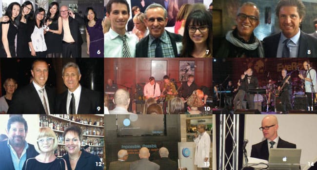 6. A&A Optical's Robert Liener with the Jimmy Crystal team at the Jimmy Crystal Party; 7. (l to r): Kevin Hundert, Mike Hundert, and Gilda Mehraban at the Tumi Champagne Toast; 8. Cirillo Marcolin (l) and Fabrizio Gamberini (r) at the Diesel event; 9. Transitions' Brian Hauser (l) and Essilor of America's Bob Colucci (r) at the Eyes on New York Gala; 10. Bad Habits performed at Dave & Buster's in Times Square; 11. Eye Rock featured optical industry musicians in a concert benefitting OneSight; 12. (l to r) Marchon's vice-chairman Al Berg with the OWA Pleiades Award winner Shirley Platzer-Stocks and Reed's Val Scott; 13. Transitions Optical held informational sessions regarding Vantage lenses; 14. Eye-Med's John Lahr, OD, spoke at the lunchtime SUN event co-sponsored by Luxottica, the AOA, OAA, and The Vision Council