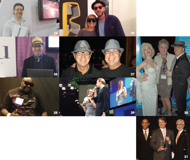 24. Todd Geshenow of Eyesfirst in Middletown, N.J., was one of the lucky winners of a new Apple iPad during Shamir's daily raffles; 25. Mykita's Xenia Deger and Moritz Kruger at the Leisure Society party held at Hudson Studios; 26. Rob Robillard, CEO of ICU Eyewear (formerly Zoom Eyeworks), discussed the company's rebranding efforts during the ICU press conference; 27. Santinelli's Joe (l) and Gerard Santinelli (r) worked the congas during the Eye Rock concert; 28. Christopher “Big Black” Boykin at the Fatheadz Eyewear booth; 29. Safilo's Eden Wexler and fashion expert Carson Kressley welcomed the crowd during the Safilo Fashion Show; 30. Opti-Port member Diana Hall, president of Bard Optical, Peoria, Ill., with Marilyn Monroe and Frank Sinatra impersonators at the Opti-Port Reception; 31. Johnson & Johnson Vision Care president Dave Brown (c), who was honored at the Eyes on New York Gala, with Johnson & Johnson vice president Michael Sneed (l) and David Heath, OD, president of SUNY College of Optometry (r)