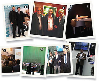 1. Dr. Thomas Windischbauer, MBA, COO/CFO (l), member of the executive board, and Silhouette CEO and executive board member Daniel Rogger discuss the company’s plans for its anniversary year and the future; 2. (l to r) The Vision Council’s Ed Greene, Shamir CEO and The Vision Council chairman Raanan Naftalovich, and Francesco Gili, vice chair of ANFAO, at an event hosted by The Vision Council’s European Sunglass Association division in Milan; 3. At GARAGE MILANO in Milan, Marcolin hosts an opening of the Sguardi “Views,” which featured a sensorial pathway that walked guests through 14 of Marcolin’s brands represented by installations, all created by young Italian artists through several kinds of mediums and art expressions (Mont Blanc installation shown); 4. Jacky Lam, general manager at Okia, presents the company’s latest, a High Definition Acetate that is green while offering the appearance of textures in crisp detail; 5. A lounge in the design area is hopping; 6. Blackfin presents its partnership with Cipriani, illustrating true “Made in Italy” style; 7. MEI System Inc.’s U.S. sales director Barry Lee presents the company’s smaller, dispensary-friendly system